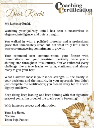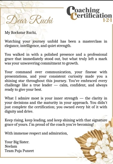 Ruchi has been an amazing coach to me. In every session, she brought out the best in me while gently guiding me through areas of improvement. Her solutions were always simple, practical, and easy to integrate into my busy life with kids at home. Our 1:1 calls felt stress-free yet deeply insightful, leaving me more confident each time. I’m truly grateful for her guidance and wisdom. I also know that whenever I need advice, I can always count on reaching out to her.